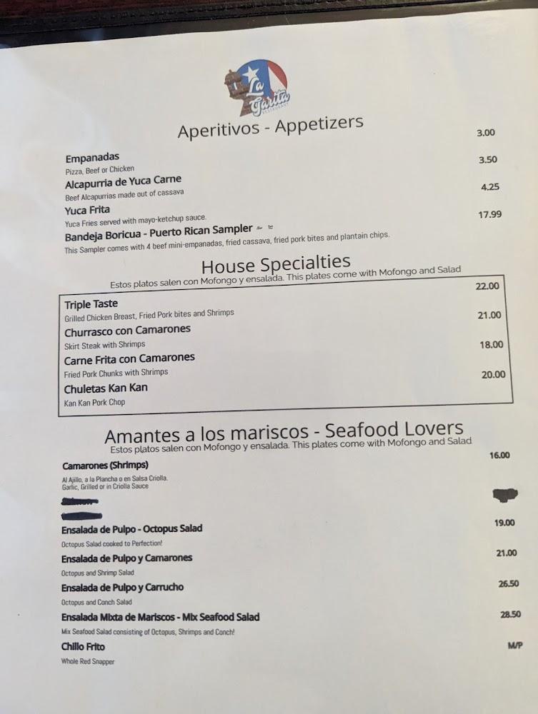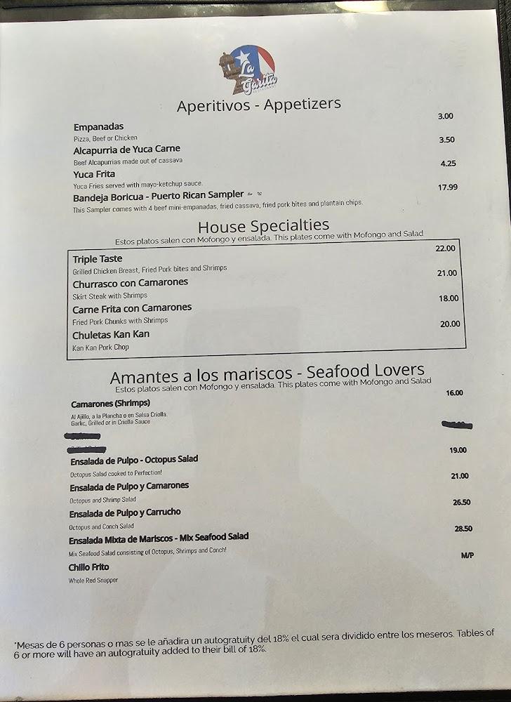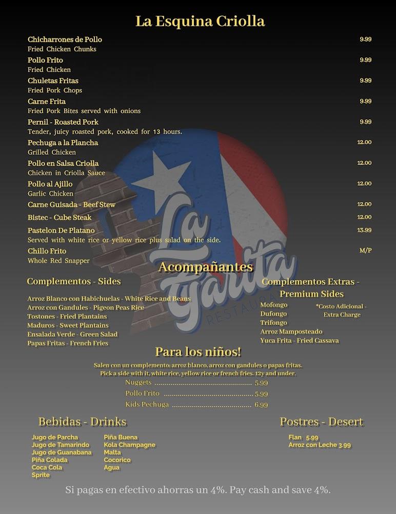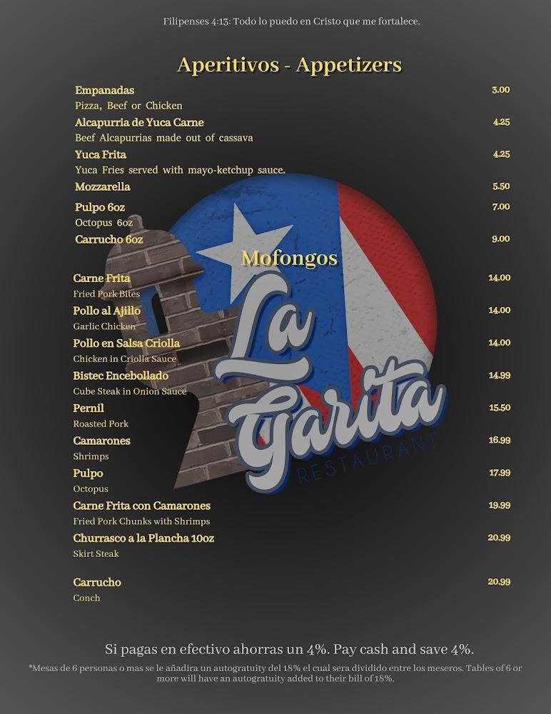 The menu at La Garita showcases a variety of traditional Puerto Rican dishes. Highlights include Mofongo, with options like garlic chicken and skirt steak. Each selection offers a distinct flavor profile. Their Empanadas, filled with chicken, shrimp, or octopus, are perfect for starters and are popular among guests. Additional offerings include delectable fried plantains and rich rice and beans. Vegetarian options also exist, catering to diverse tastes. Desserts, though less emphasized, provide a nice sweet finish to a meal. Overall, the menu celebrates the culinary traditions of Puerto Rico, making every visit a treat.